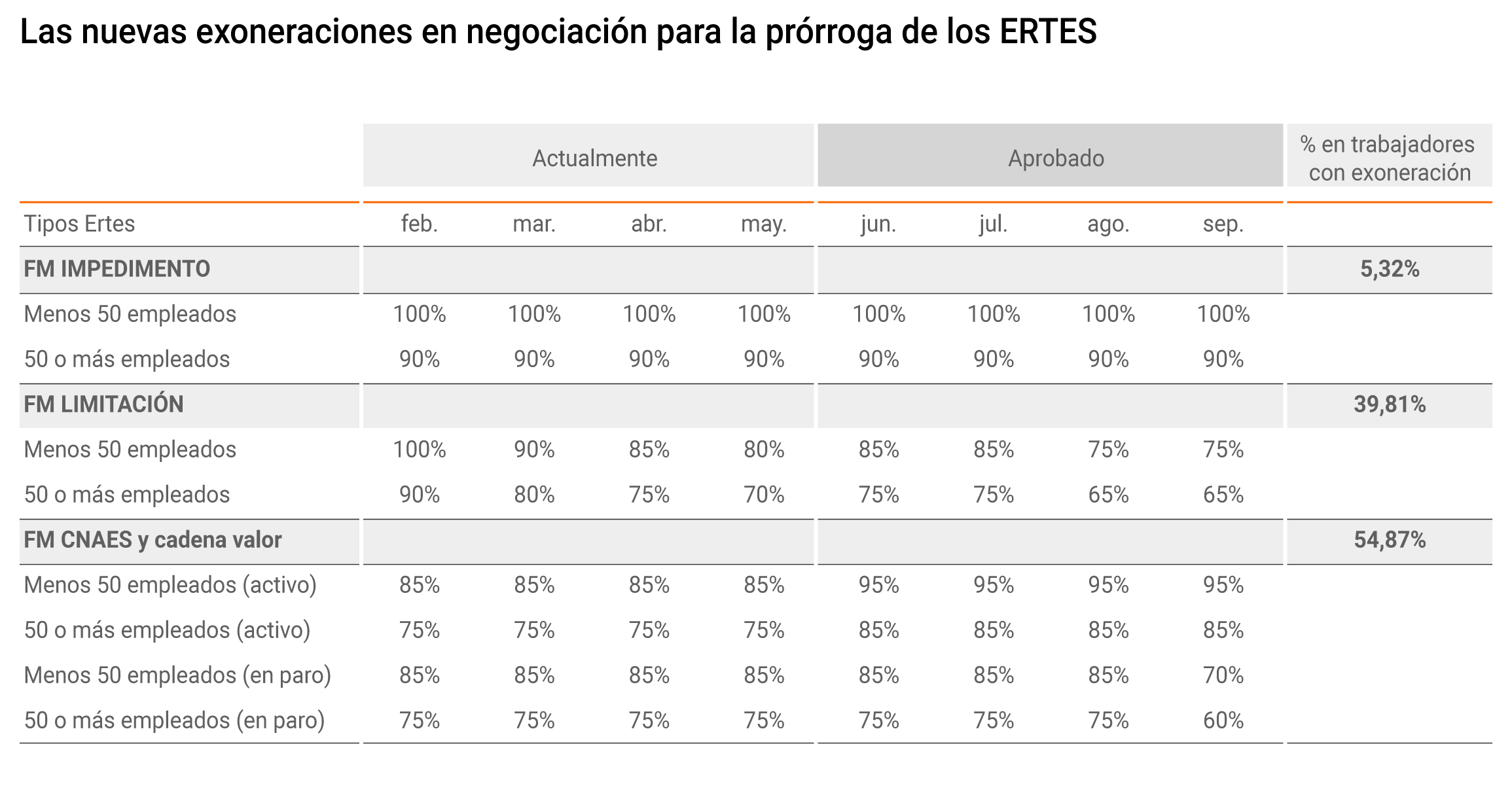 Dentro de las tres categorías de ERTE, el acuerdo contempla que en el caso de los de impedimento, a los que se acogen las empresas de cualquier sector que no puedan tener actividad por restricciones sanitarias, las exoneraciones se mantendrían en el 100% para empresas con menos de 50 trabajadores y en el 90% para aquellas con más de 50.